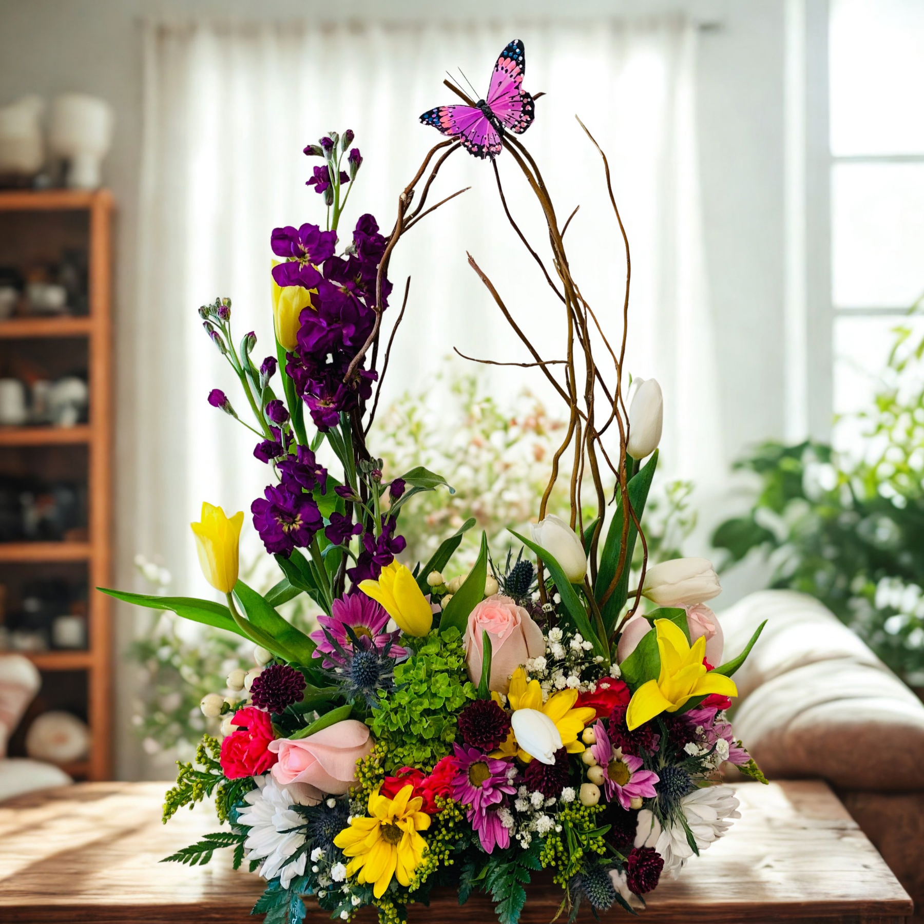 Blooms that bring spring Meadows alive in your Home. The earthy mixtures of delicate florals, grasses, and butterflies display the vibrant personality of this floral design. Unique integrity to each design, composed of the best florals in bloom, and this photo poses an example of the beauty you could send in a butterfly meadow.