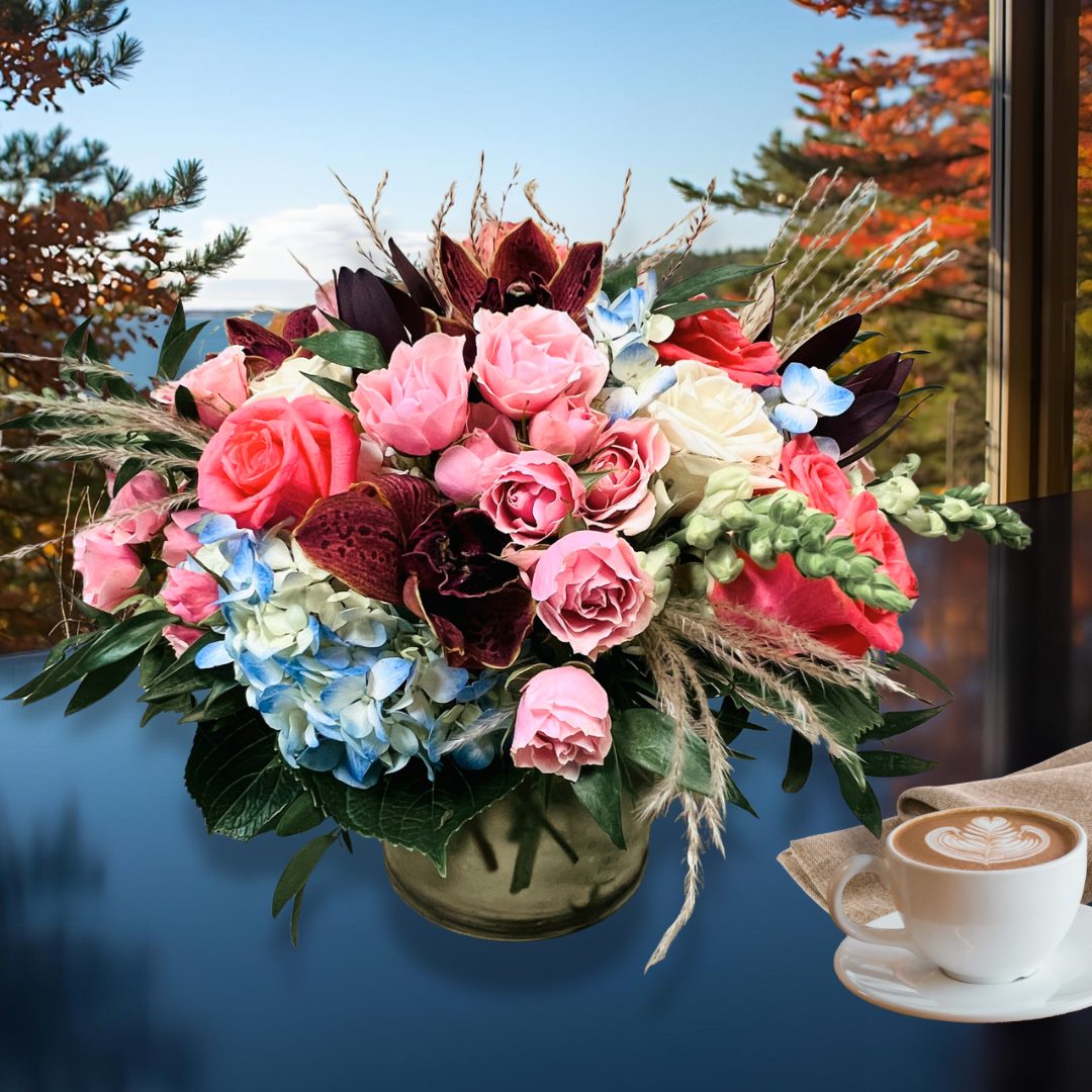Blushing blooms, bronzy Autumn glory and hues of blues, reminiscent of costal seaside florals.