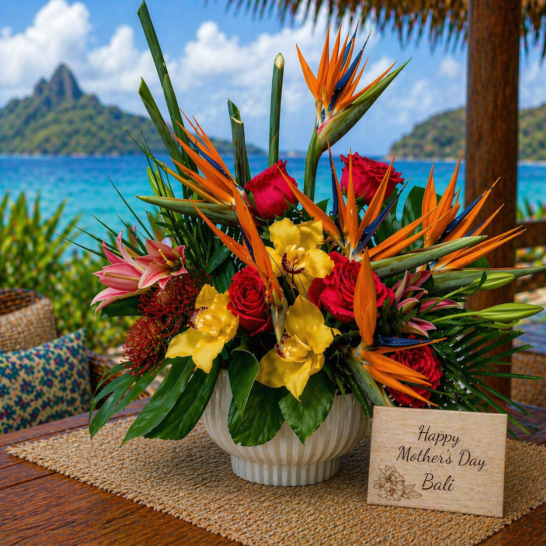 Bali is a tropical Mother’s Day floral arrangement inspired by islands and luxury. Designed with bold roses, bright cymbidium orchids, textured pincushion blooms, and lush tropical foliage in a modern container. Its rich color palette and sculpted shape make it a striking gift for moms who love warm, vibrant, upscale style. Available for Mother’s Day flower delivery and pickup in Naples, Florida while supplies last. Also a beautiful option for other occasions like birthdays , thank you and anniversary.