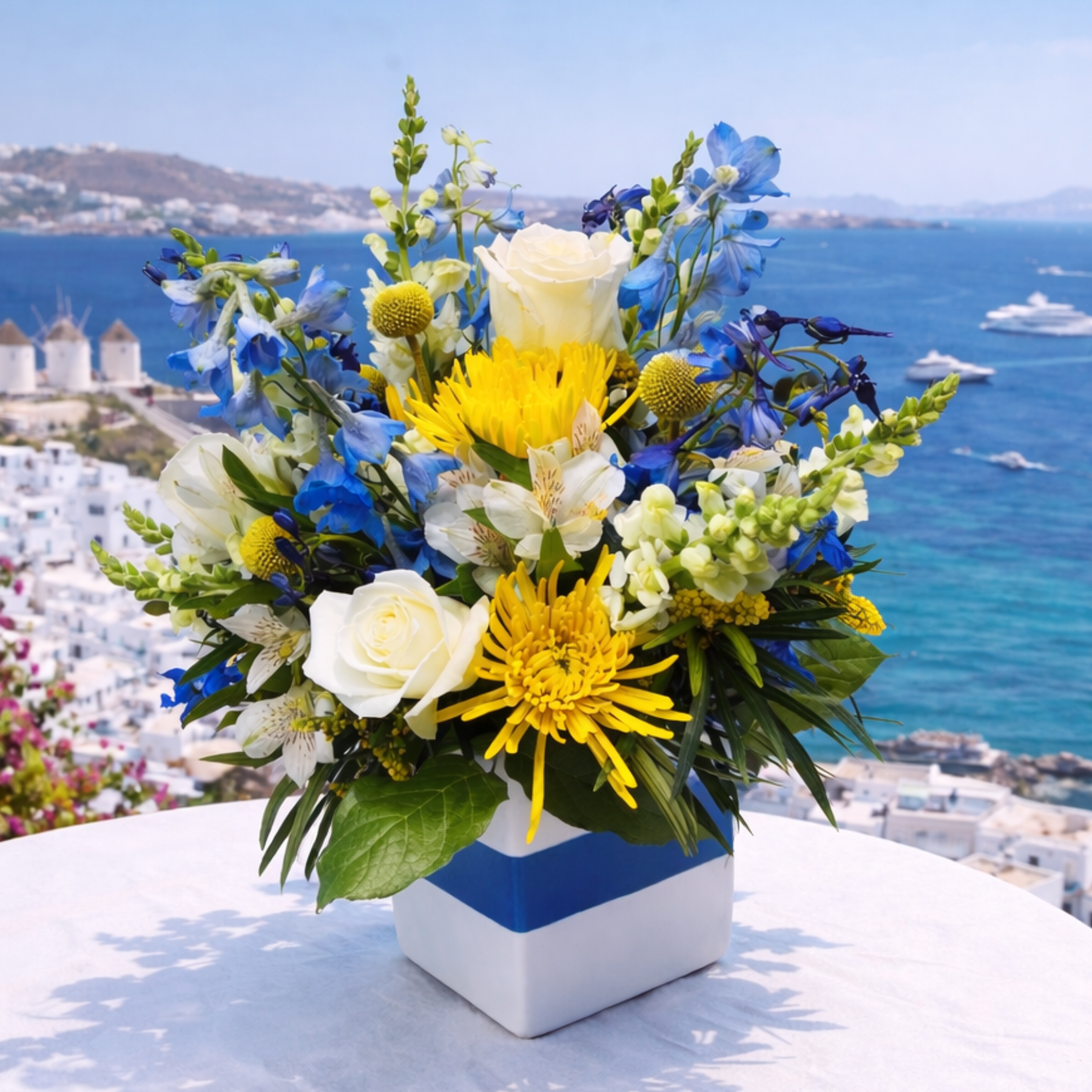 A cheerful floral gift inspired by Mykonos and made to brighten Mom’s day. Arranged in a modern keepsake cube vase, this bright and elegant piece features white roses, vivid blue delphinium, sunny yellow spider mums, alstroemeria, snapdragons, and fresh seasonal greenery