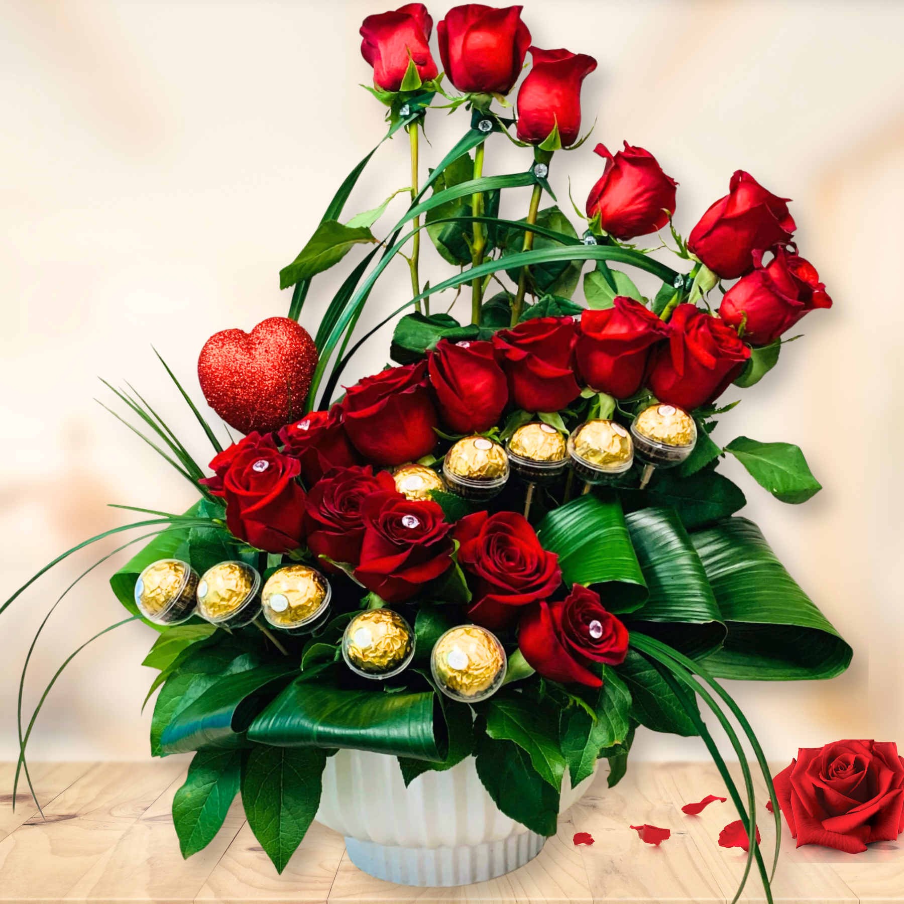 A stunning cascade of rich red roses, flowing greenery accented by diamond studs and golden chocolates, designed for the love that amazes you.  Unforgettable and deeply cherished with every look it will touch every place in your valentine's heart.