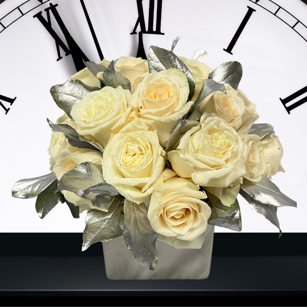 This floral arrangement, aptly named "Ball Drop," captures the quintessential spirit of New Year's Eve celebrations. It boasts a collection of pristine white roses, each bloom as full and round as the iconic Times Square ball. The roses are nestled amidst a cascade of silver leaves, their metallic sheen reminiscent of the sparkling descent of the New Year's ball at midnight. The arrangement is presented in a simple yet elegant square silver vase, embodying the modernity and excitement of the countdown to the new year.