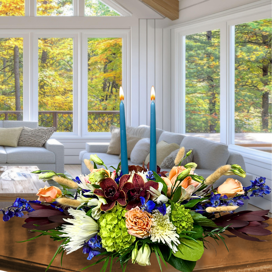 Countryside Cottage is a charming centerpiece in the hues of blue, peach, whites and greens. Blue Delphinium, peach colored Roses, green Hydrangea and white Fuji Mums and Lisianthus are nestled below 2 blue tapper candles. Chocolate Cymbidium Orchids an Leucadendron give it a rustic feel and dried Bunny Tails give it a natural flair.