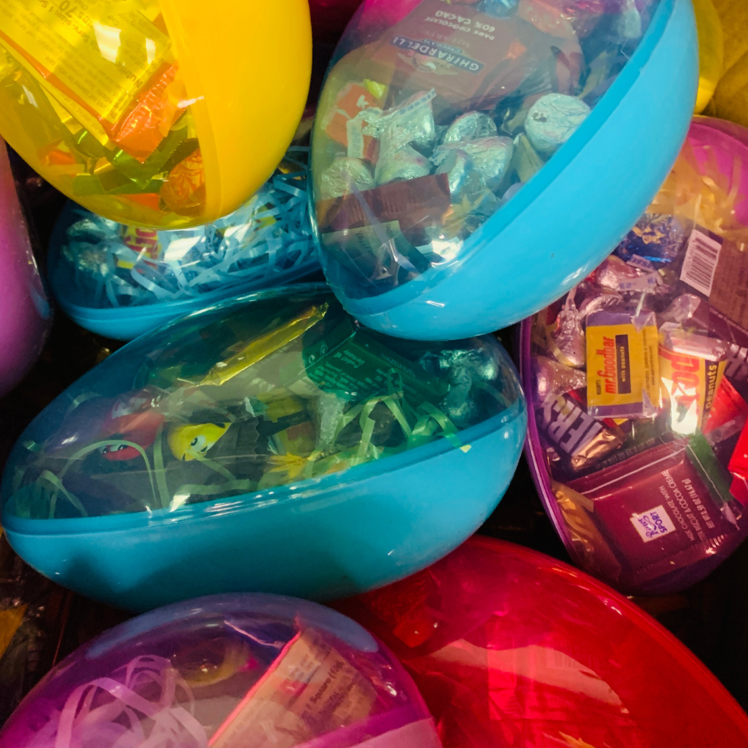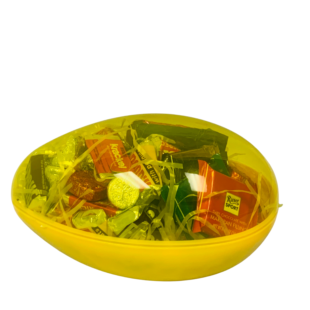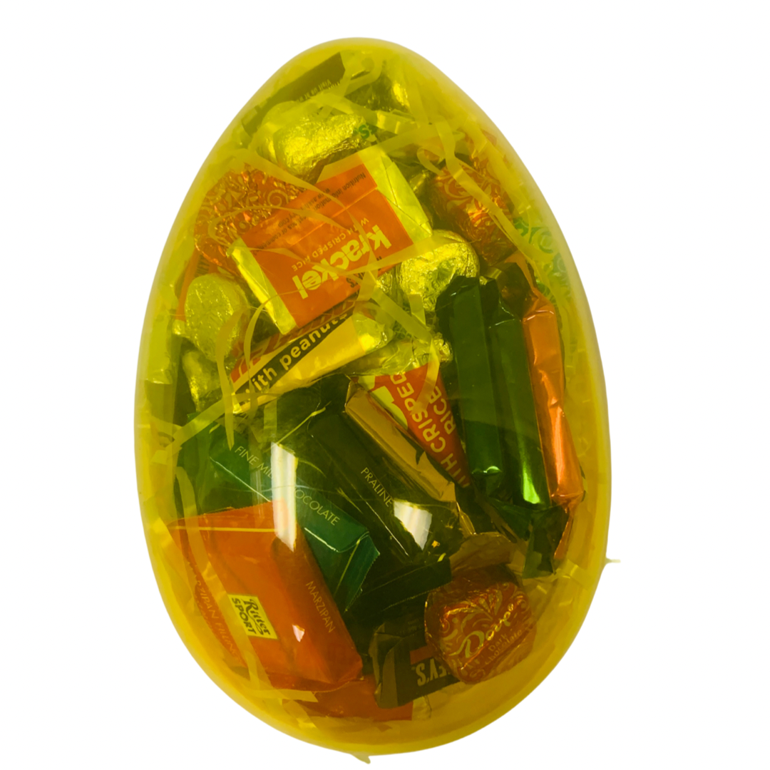 Eggs Surprise comes in assorted colors of pink, purple, yellow, and blue. It is 7” long with assorted candy. It May contain nuts.